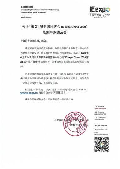 2月26日,中國環(huán)博會主辦方發(fā)布《關于“第21屆中國環(huán)博會IE expo China 2020”延期舉辦的公告》并宣布,原定于2020年4月21-23日于上海舉辦的第21屆中國環(huán)博會延期舉辦,“延期后的具體時間將另行通知”。
