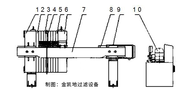1、止推板 2、頭板 3、濾板 4、濾布 5、尾板 6、壓緊板 7、播梁 8、液壓缸 9、液壓缸座 10、液壓站