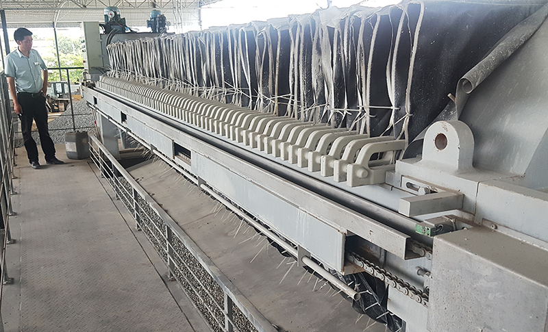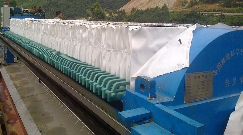 其次,還應(yīng)注意入料濃度和壓力。入料濃度愈高,在壓濾過(guò)程中污泥充滿濾室所需的時(shí)間愈短,則污泥廂式壓濾機(jī)的處理能力愈強(qiáng),濾餅水分也愈低。雖然較高的入料濃度有利于壓濾效果的改善,但入料濃度也不宜太高。一般要求入料濃度在300g/L以上,最好在500g/L左右,最高不要超過(guò)800g/L。入料壓力愈大,濾餅水分愈低。如果壓力過(guò)大,雖然有助于縮短成餅時(shí)間和降低濾餅水分,但效果并不顯著。一般入料壓力為0.4—0.8MPa是最佳狀態(tài)。