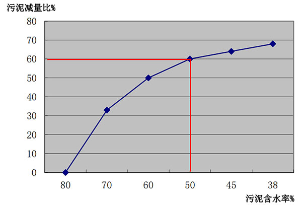 從污泥減量比與污泥含水率對應圖中可以看出,對于相同的污水處理量,隨著污泥含水率的降低,污泥減量比逐漸增加;假定含水率80%的污泥減量比為0作為基準值,污泥含水率在50%時,污泥的減量比達到60%,金凱地超高壓壓濾機處理后污泥含水率在50%以下,污泥減量比超過60%,實現污泥減量最大化。